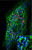 A. Confocal image of HeLa cells stained with FM4-64 to the plasma membrane (Red) and Lysotracker Green to lysosomes (Green) B. Serial sections of U2OS cells nucleus expressing the recombinant protein H2B-RFP for histones staining C. Confocal image of HeLa cells expressing the mitochondrial marker Mitotracker Deep Red (blue), the endoplasmic reticulum marker Sec61B-GFP (green) and the lysosomal dye Lysotracker Red (red) |