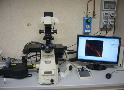 Live Scan Swept Field Confocal High speed confocal fluorescence microscopy system for the analysis of multiple cellular parameters. Simultaneous measure of calcium concentration (cytoplasmic/mitochondrial), protein translocation, cellular structures redistribution, generation/lost/fusion of vescicles. There are three lines of excitation (488nm, 561nm, 635nm) and two different emission filterset (488/561, 488/643). This system allows simultaneous visualization of two different fluorophores. |